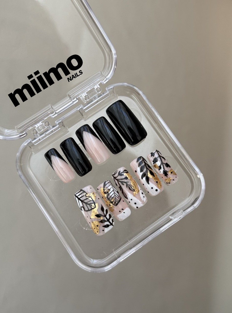 یک ست ناخن مصنوعی با طرح برگ مشکی و زمینه نود. بسیار کلاسیک و مخصوص خانم های خوش استایل.